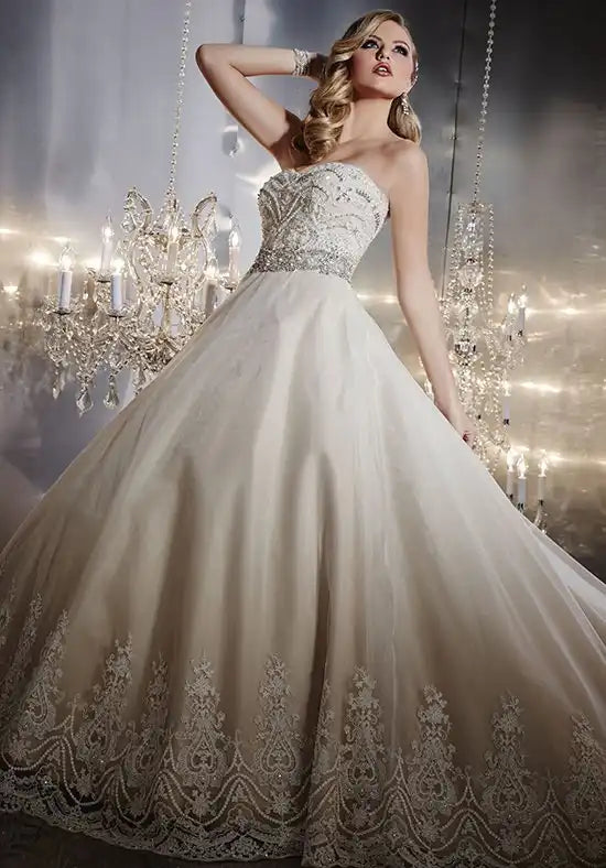 Strapless Lace Bodice gown with heavily beaded waist band. Tulle skirt with beaded Lace Hem. Zipper back with bodice button.