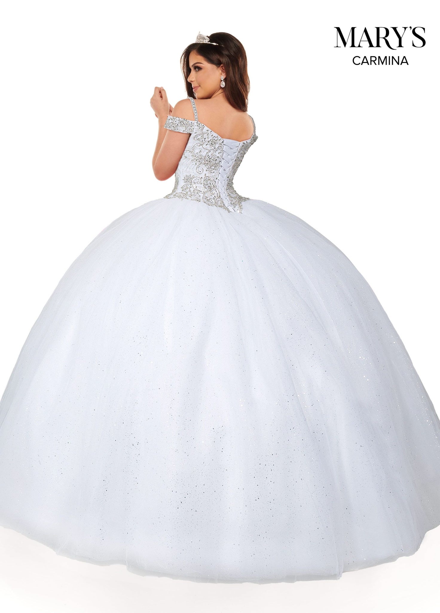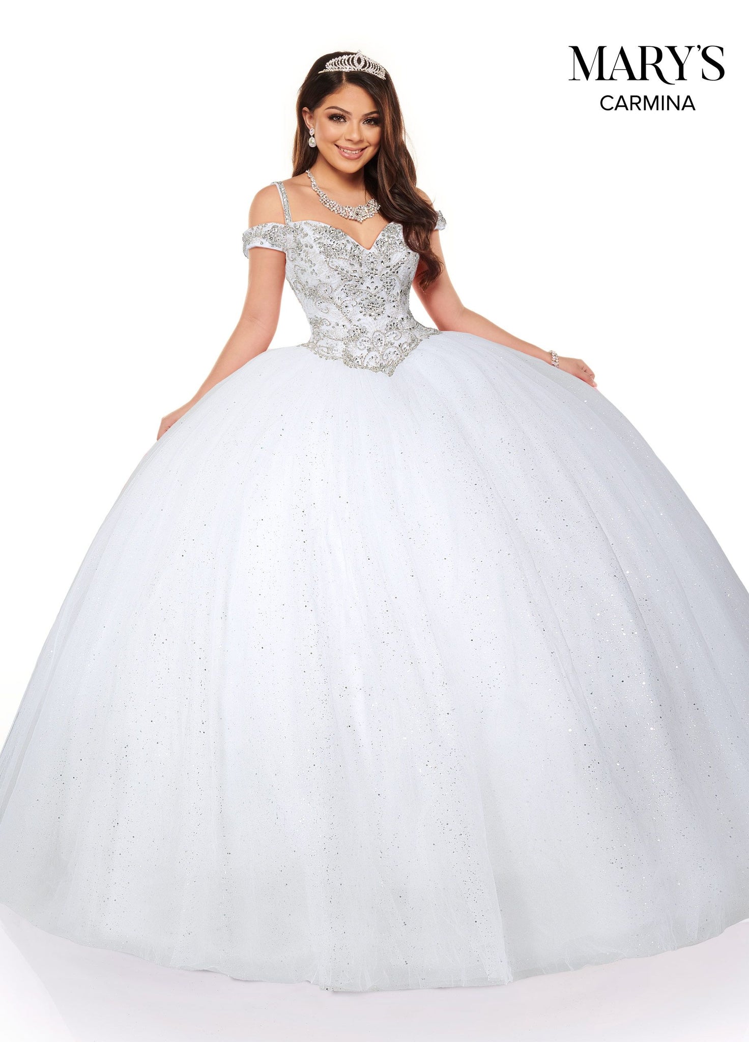 This Marys Bridal MQ1001 sparkling tulle quince dress features an intricately beaded bodice, with cold-shoulder straps framing the sweetheart neckline. The laced-up back tapers the embellished top into the basque waist, meeting the full ballgown skirt. Set includes a sheer, short-sleeved bolero.